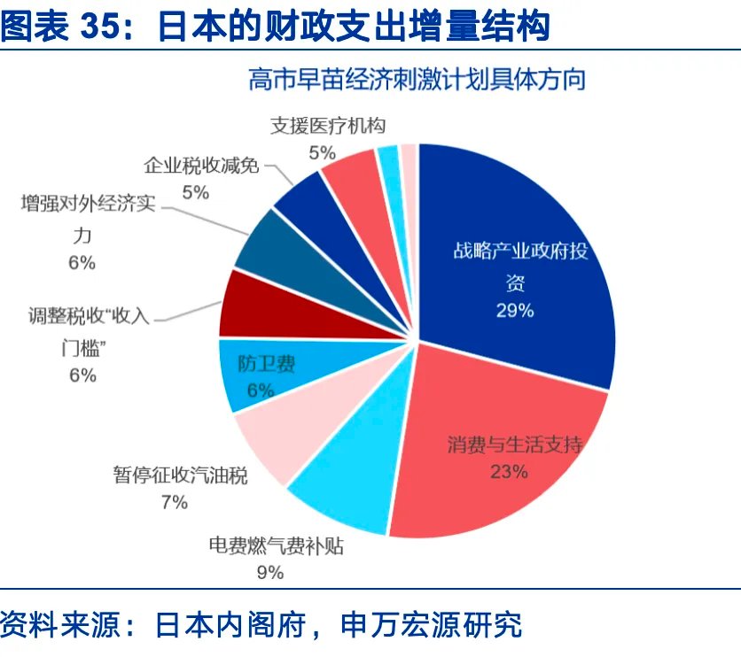 日本财政特征是高债务环境下大幅增加AI等战略产业投资,加速国防投资,需求端继续支持民生与抗通胀。2025年日本政府债务率234%,远高于欧美主要经济体。2025年政府利息支出占GDP比重1.5%,高市上台后,日本政策重心转移,不再强调单年度的基础财政平衡,在高债务环境下继续加大扩张力度。产业投资上,2026年,日本将AI与半导体投资资金划归为常态预算,2026年AI与半导体相关预算升值1.2万亿日元,是去年的4倍。国防层面,日本2026年国防预算9.0万亿日元,增速3.8%,提前一年达成GDP 2%的目标;需求措施上,高市早苗的刺激计划侧重于通胀补贴与民生保障,总额共11.7万亿日元,包括家庭电力、燃气费用补贴、儿童补助、减税等,起到压低通胀效果。