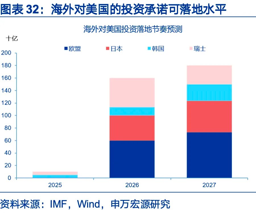 美国的财政支出集中在国防、基建链条,国防支出2027年增速或达50%,再军事化或将提速。2026财年美国国防支出预计增加10.4%至10119亿美元,增速达2008年以来新高;川普计划在2027年将国防支出抬高至1.5万亿美元,增速接近50%。边境及移民支出由2025年的648亿增加至2026年的1070亿美元。主因是美丽大法案一次性拨款1910亿美元,分4年使用,平均每年额外增加475亿美元。此外,贸易协议中,欧盟、日本、韩国等对美国投资承诺总额为1.7万亿美元,2026年也可带来投资增量。