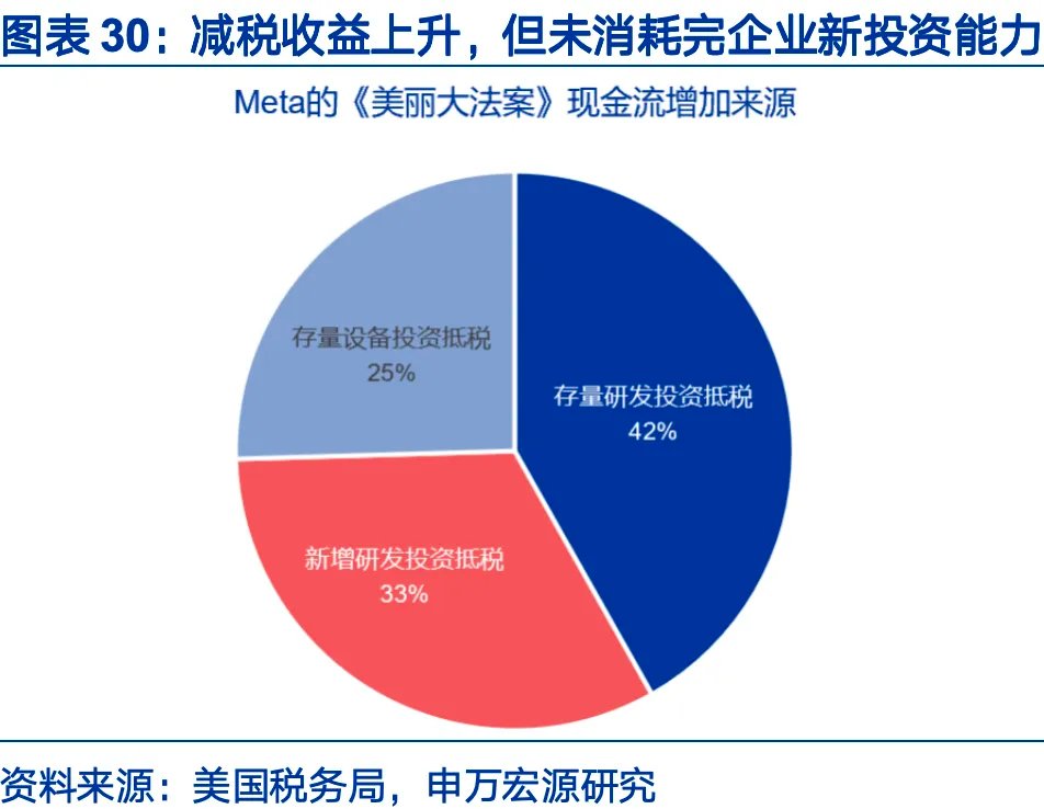 美国财政的特征是高度重视减税,通过税收激励提振消费与投资,扶持战略产业。2026年美国总体减税规模3960亿美元,相比2025年的2682亿上升47.7%。其中,个人层面减税规模2750亿;企业层面减税规模1210亿,企业层面的主要增量措施包括:1)提高半导体制造投资税收抵免,2025年12月31日之后投入使用的设备,抵免比例从25%提升到35%,须在2026年底前开工。2)加速折旧。2025年1月19日之后,企业购买设备、机器、建厂,可在当年一次性全额扣除,是对企业资本开支的直接刺激。3)研发支出费用化。2025年1月1日起,允许企业全额抵扣研发费用,可改善研发密集型企业(半导体、软件、AI等)的税后现金流。谷歌2025年通过法案获得179亿美元现金,占2024年现金规模的18.7%,亚马逊则为156.7亿美元,占比16%。