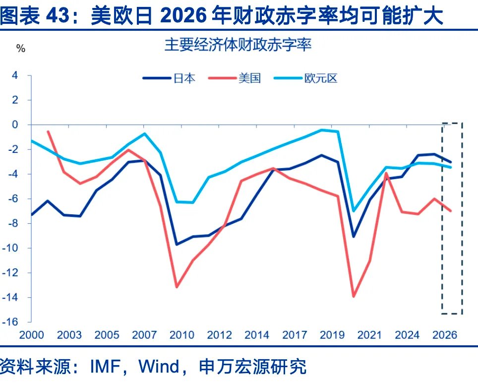 力度上,最突出的变化是,美欧日财政在非衰退情形下同步加码。这标志着财政目标的转变,从防衰退转向安全目标、产业竞争。2026日本赤字率或扩大0.8个点至3.2%,美国扩大0.8个点至6.8%、德国扩大0.9个点至4.0%,欧元区上升0.1个点至3.3%,美欧日财政脉冲高于一般年份。