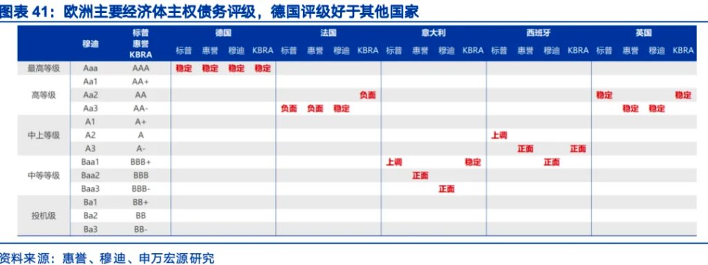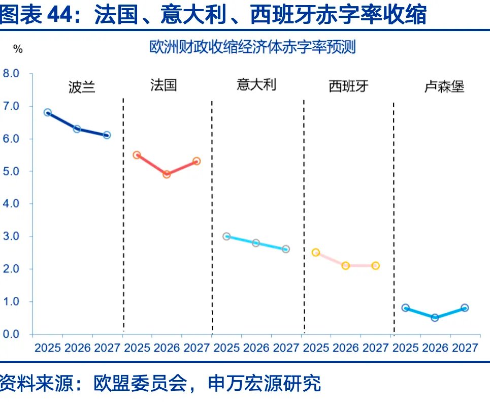 2026年海外财政顺周期扩张,力度高于一般非衰退年份,美日领跑财政扩张,欧洲内部分化较大,主要增量在德国。2026年,日本赤字率扩大0.8个点至3.2%,美国赤字率扩大0.8个点至6.8%,欧元区总体赤字率仅小幅上升约0.1个点至3.3%,其中荷兰扩大0.8个点至2.7%,德国预计扩大0.9个点至4.0%,在欧洲内部属于财政扩张幅度靠前的经济体。法国、意大利进入财政整顿程序,法国2026年赤字率预计下降0.6个点至4.9%,意大利预计下降0.2个点至2.8%。