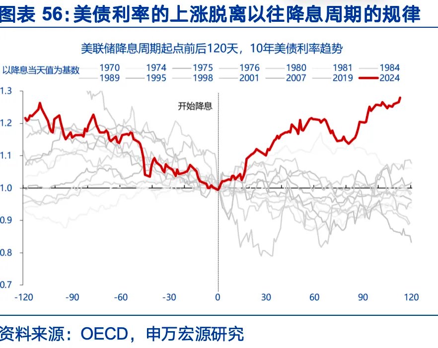 财政对货币政策产生更大的影响,货币独立性的边界受到侵蚀。一方面,通胀与就业受到财政的更直接影响,更高的财政力度导致通胀粘性更强,更易超预期。受川普关税的影响,2025年1月以来美国商品、耐用品通胀指数脱离长期趋势,出现反弹,造成美联储降息时点延后。再次,财政的节奏直接影响了货币政策节奏。例如,2025年11月21日,高市早苗公布财政刺激方案后,2025年12月日央行加息预期随之抬升,宽财政造成日元承压,通胀预期抬升,导致日本加息提前。最后,央行使用利率调节总需求的能力被削弱。2022年的加息环境下,美国财政仍在支撑经济需求,迫使央行需要更强的紧缩程度;2024年以来的降息环境下,长端利率因期限溢价,未能明显回落,也压制私人需求的修复。