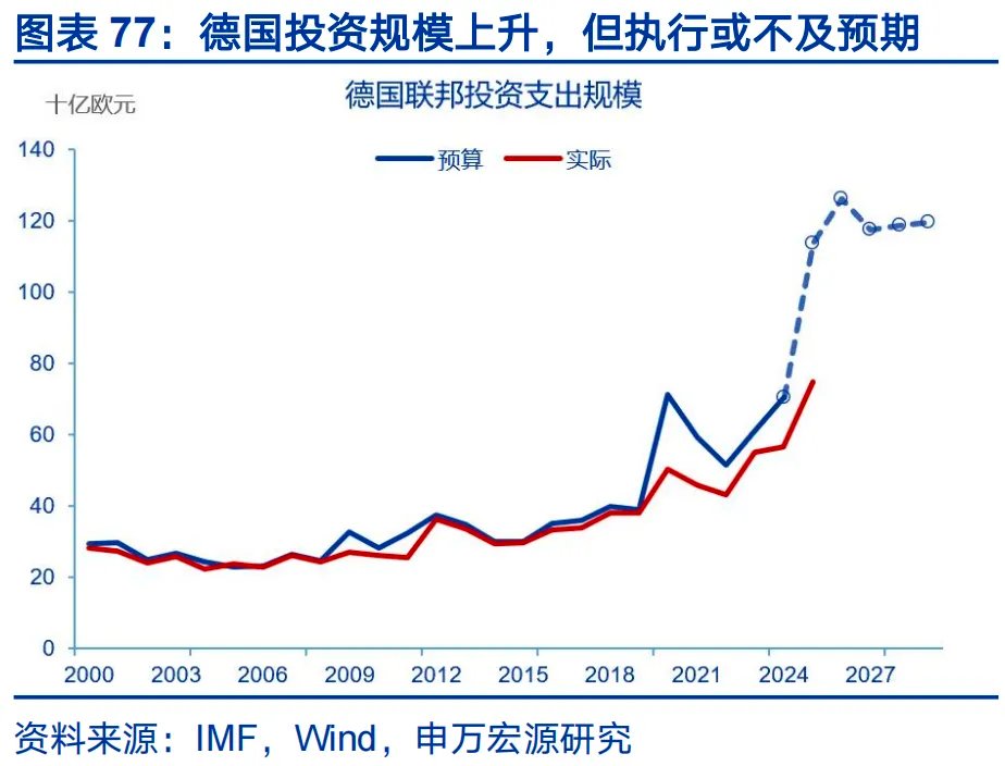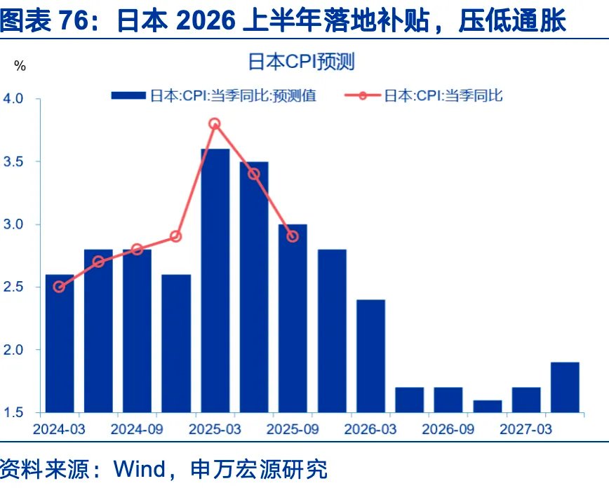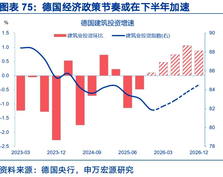 欧洲经济依赖于德国的外溢,德国依赖于投资项目落地进度,落地进度存在偏慢可能,日本高债务叠加利率正常化,增量效果或相对偏弱。德国是欧洲的主要财政扩张经济体,国防与基建投资是核心,其政策节奏依赖债务融资与项目拨付进度。2025年四季度,德国债务融资增速出现扩张,2025年12月德国议会批准了500亿欧元的国防订单,国防生产或较快回升,2026年下半年建筑及设备投资增速可能出现提升。但参考以往预算经验,德国实际进度往往不及预算水平。日本财政补贴上半年投放,可起到阶段性降低通胀的作用。日本于2026年1月开始发放家庭补贴、通胀补贴,可压低日本整体通胀增速压低0.7个百分点,高债务或导致日本增量效果较弱。