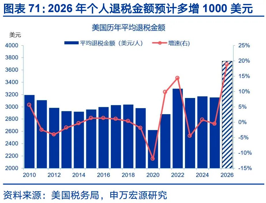 具体到财政的拉动方式上,美欧日财政的作用方式各不相同,美国财政拉动表现为减税脉冲。美国2026年二季度或形成一轮减税脉冲,下半年或因中期选举加码。《美丽大法案》减税措施或在2026二季度(2月开始退税,4月前后为高峰)集中落地,形成一轮退税潮,退税总额或增加30%达到4120亿美元,人均退税规模或增加700至1000美元至3743美元。退税包括:1)标准扣除额增加;2)小费、加班费及汽车贷款利息扣除;3)儿童税收抵免增加;4)州和地方税扣除(SALT)从1万美元提高到4万美元;4)老年人额外扣除。2026年退税规模与2008年960亿现金支票补贴规模较为接近,2008年的补贴拉动当年二季度消费增速1.8个点,GDP增速1.3个点,拉动三季度消费0.8个点、GDP增速0.6个点。本轮减税或可提振2026年上半年增速。