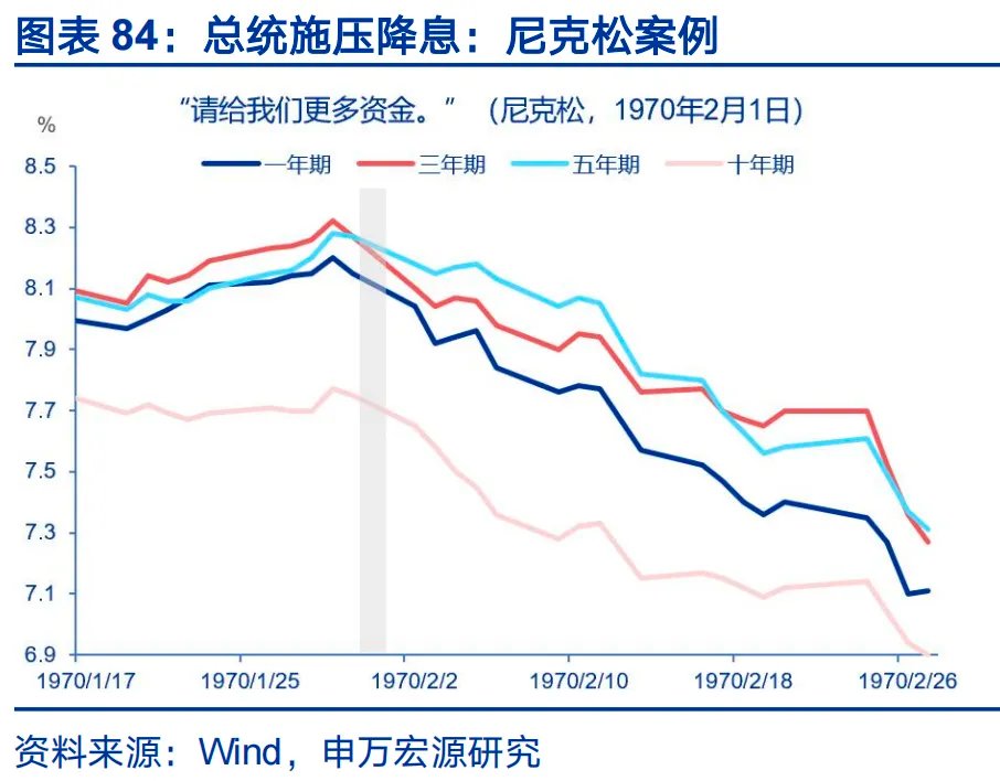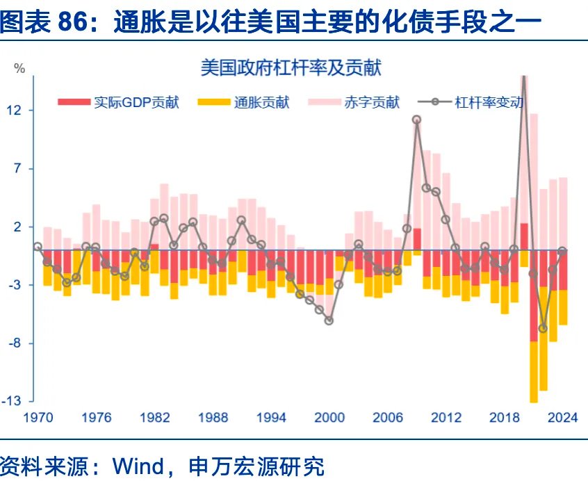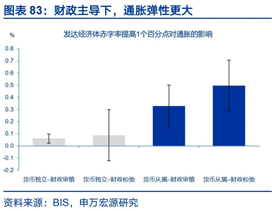 债务风险的变化或要求化债方式转变。以美国为代表的发达经济体,传统化债手段包括:财政整顿、金融抑制、通胀化债。首先,财政整顿在现有地缘、政治环境下或难以实现。财政紧缩是主权债务危机导致经济衰退的主要机制之一,在债务危机下,政府被迫紧缩,现金流切断,冲击实体经济,如2010年希腊债务危机,2013年美国的政府关门冲击等。2025年以来的债务风险主要体现为利率上冲,违约压力不足以迫使各国政府收紧财政,产业竞争、地缘压力迫使财政紧缩可行性下降。其次,金融抑制及通胀化债或不具备实施的条件,二者有其适用的经济环境:压倒性政治目标(战争),受限的资本流动,可控的国内金融体系,受限的替代投资渠道。金融抑制及通胀化债一体两面,通常配套实施,前者压低名义利率,后者稀释债务实际价值,共同构成负实际利率。若川普强行压低利率,可能削弱央行政策信誉,通胀预期或失锚,触发市场无序利率上行。参考BIS研究,财政主导体制下,赤字率每增加1个百分点,未来两年的平均通胀率上升约0.5%。货币主导体制下,赤字率增加1个点,仅导致通胀上升约0.1%。但不意味着川普不会挑战美联储独立性,从历史上尼克松及约翰逊的案例看,在不触发市场反噬的情形下,总统施压有助于压降政策利率预期与中长端收益率。但若突破市场预期,或导致相反效果。