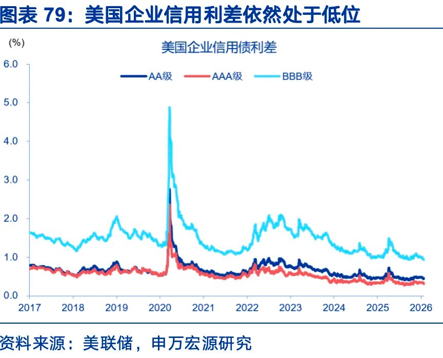 第三、地缘风险与主权债务风险高度融合。更高的地缘不确定性倒逼国防扩张,地缘风险由于难以量化,只能通过更高的风险溢价来定价,债务风险与地缘风险同频共振。第四、风险并未出清,而是不断积累。当前,海外债务风险暂且停留在市场层面,尚未向实体经济传导。体现为:银行端,美国资产负债表存在韧性,截至2025年,美国银行业资产充足率为15.36%,较2019年抬升91BP;企业端,美国信用利差处于低位。但每次流动性冲击均在消耗市场、政策的承接能力,美债交易深度下降,做市场资产负债表压力上升,买家结构劣化。债务问题或继续以利率、汇率冲击的形式反复出现,直到某次冲击突破阈值,击穿政策空间,出现金融危机。