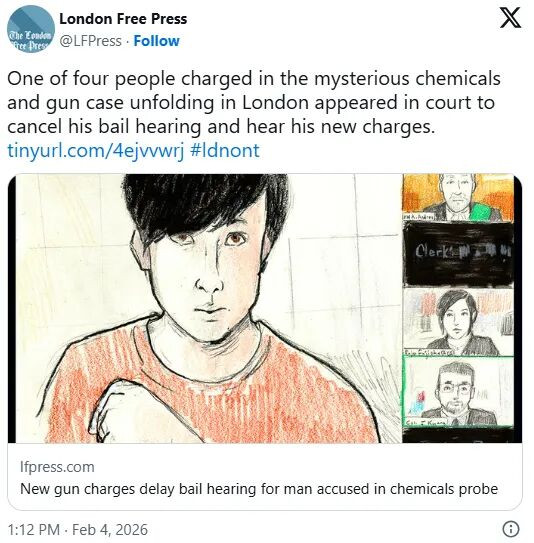 伦敦警方周二表示,Tong、Wang、Han和Ji被共同指控非法持有爆炸物、疏忽存放受限枪支、持有枪支、持有上膛的受限枪支,以及未经授权制造违禁枪支、受限枪支或非受限枪支。所有指控均与一把手枪有关。
