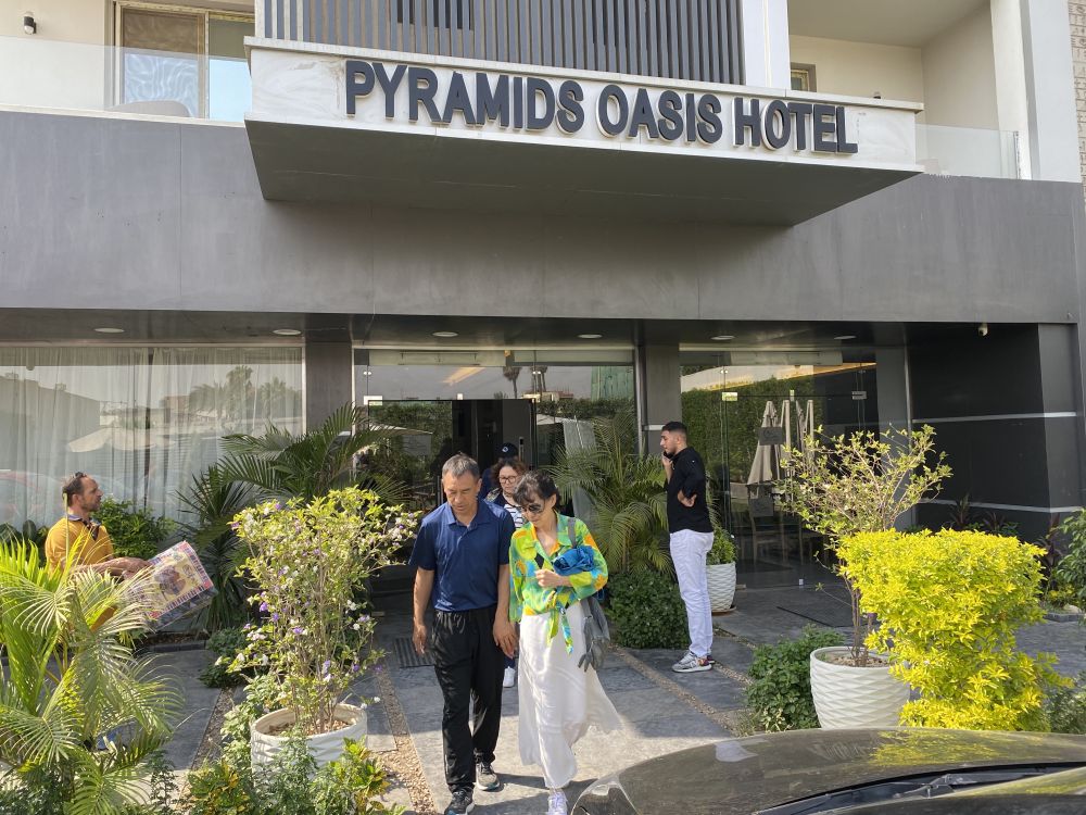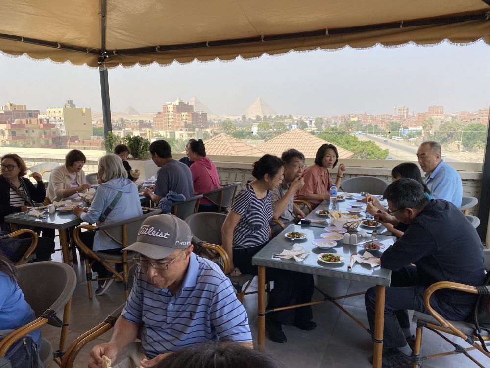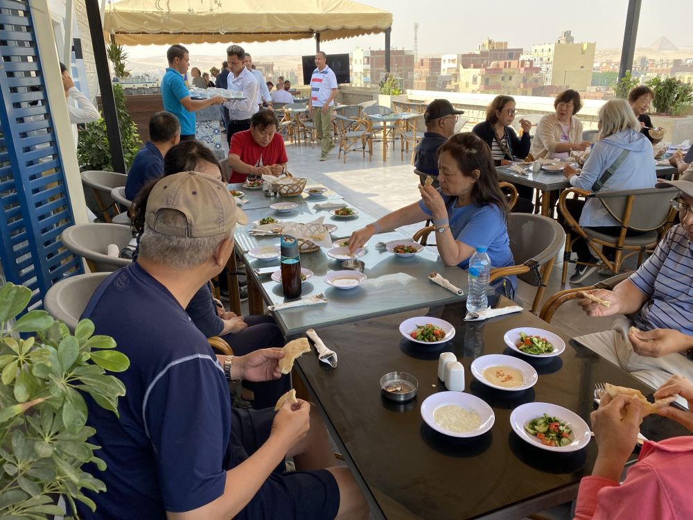 2. 午餐安排在Pyramids Oasis Hotel。这家酒店位于吉萨地区,紧邻金字塔群,距离胡夫金字塔仅几分钟车程。餐厅设在五层的露台平台上,用餐时视野开阔,一边吃饭,一边远望巍然矗立的胡夫金字塔,也算是此行在埃及与金字塔的最后一次对望。