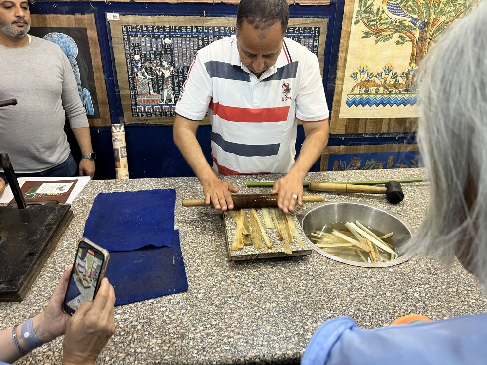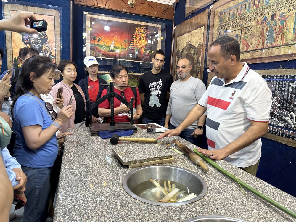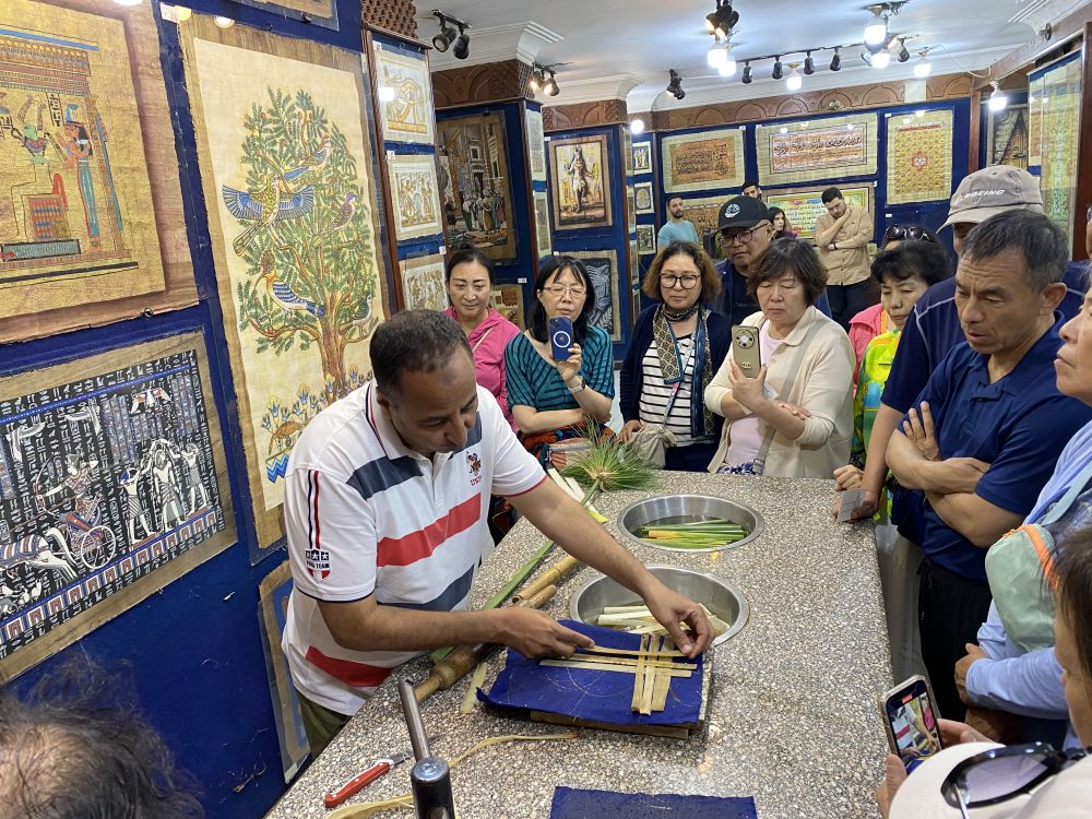 在莎草纸画店里,大力老师亲自示范了莎草纸的制作过程。从切割莎草茎、排列压制,到自然晾干成纸,每一个步骤都让人直观感受到这项古老工艺的智慧与耐心。