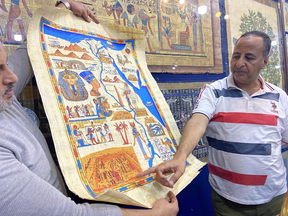 3. 莎草纸画店:莎草纸是古埃及极具代表性的文化符号之一,与尼罗河文明密不可分。它由生长在尼罗河三角洲的莎草植物制成,这种植物茎部呈三角形,高可达数米,是人类历史上最早的书写材料之一。早在公元前3000年左右,古埃及人便将莎草茎切成薄片,纵横交叠、压制晾干,制成纸张,用来记录宗教经文、历史事件、医学知识和日常事务。正是这些保存下来的莎草纸文献,使我们今天仍能了解古埃及人的信仰体系、社会结构与生活方式。