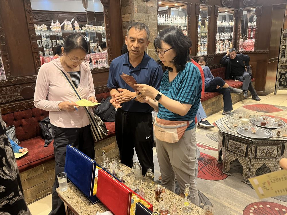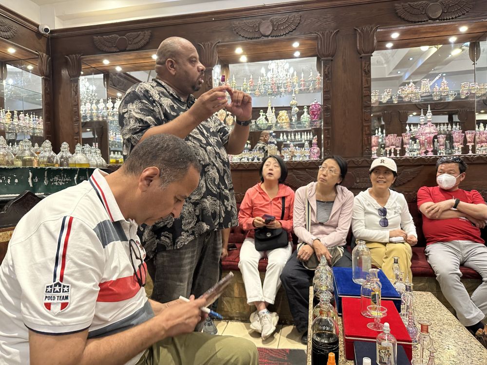 在精油店里,大家可以亲自试香,还能听店员讲解香精的制作工艺,这也是埃及行程里很有趣的一站。店里的精油据说有多种疗效,引得团友们纷纷掏钱购买,把古老的香气和智慧一起带回家。