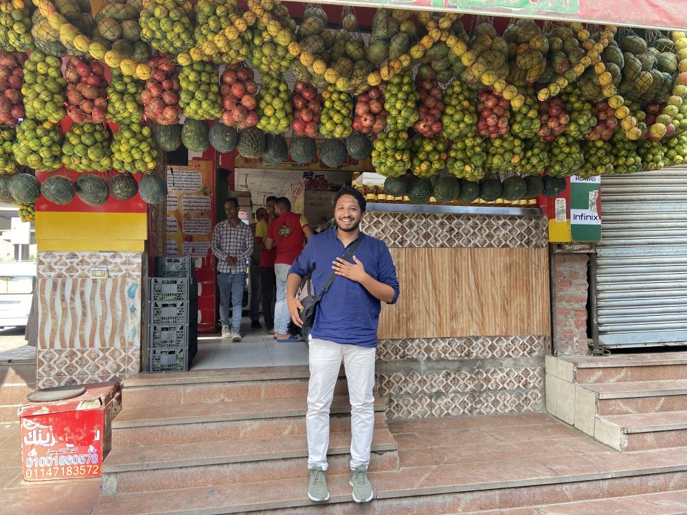 6. 大力老师的助手飞龙老弟特意来到一家水果店,为团友们挑选并购买了埃及水果,让大家现场品尝,体验当地的新鲜与风味。