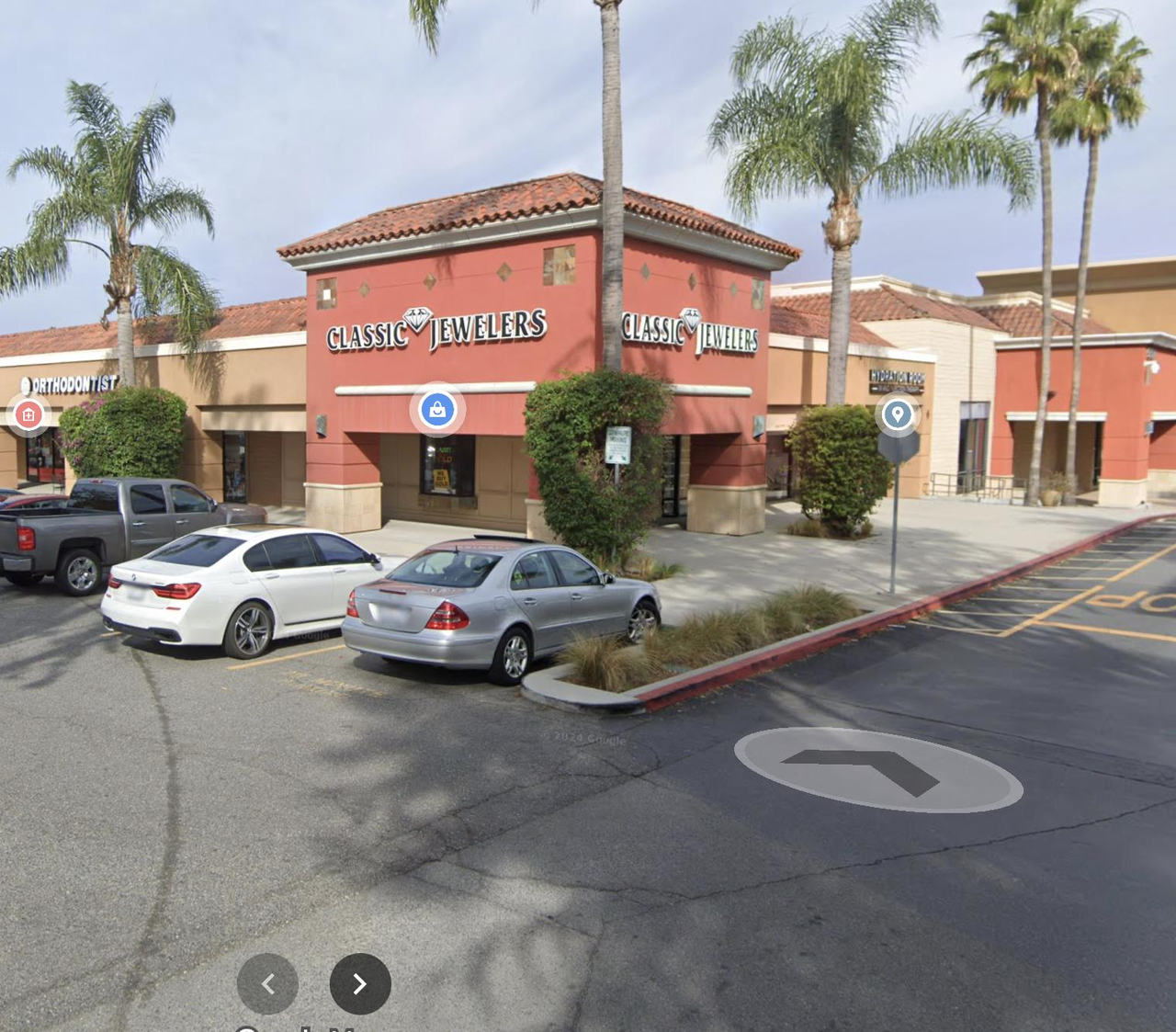 安那罕冈Classic Jewelers珠宝店,日前遭八名歹徒开车冲撞并闯入抢劫,盗走估价约75万美元珠宝及一把手枪。(翻摄自Google街景图)