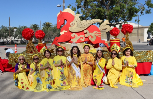 当天,韩裔团体穿着漂亮的民族服装。越南裔队伍中,女士们的黄色长裙上有漂亮的印花。越南裔瑜伽教练Ang Wing告诉记者:“我们都很高兴来尔湾参加新年大游行。”