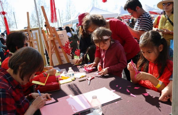 华裔团体的摊位活动尤为丰富。有的摊位教人们剪“春”字;非营利组织“橙县华人艺术家协会”为民众画绢扇,按要求写上祝福话或名字,摊位前排起长龙。