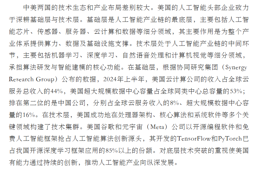 投资将是美国在人工智能领域保持国际竞争力的基础。增加投资反映了美国对中国日益发展的人工智能技术的焦虑和不安。尽管面临供应链挑战,美国在人工智能领域的投资却呈现出前所未有的增长态势。资本市场为人工智能发展注入了动力。安永会计师事务所(Ernst & Young)的调查显示,97%已投资人工智能的企业高管表示,其投资获得了正投资回报率;34%的公司计划在2025年投资1000万美元或更多。科技巨头的资本支出更是达到历史新高,亚马逊、谷歌、微软和元宇宙四家公司2024年的资本支出达到创纪录的2120亿美元,预计2025财年将达到约3610亿美元。这种大规模投资不仅推动了技术创新,还带来了实质性的经济增长。2022年第四季度以来,芯片制造商和顶级科技超大规模企业的市值累计增加了超过10.3万亿美元,为美国经济注入了强大动力。
