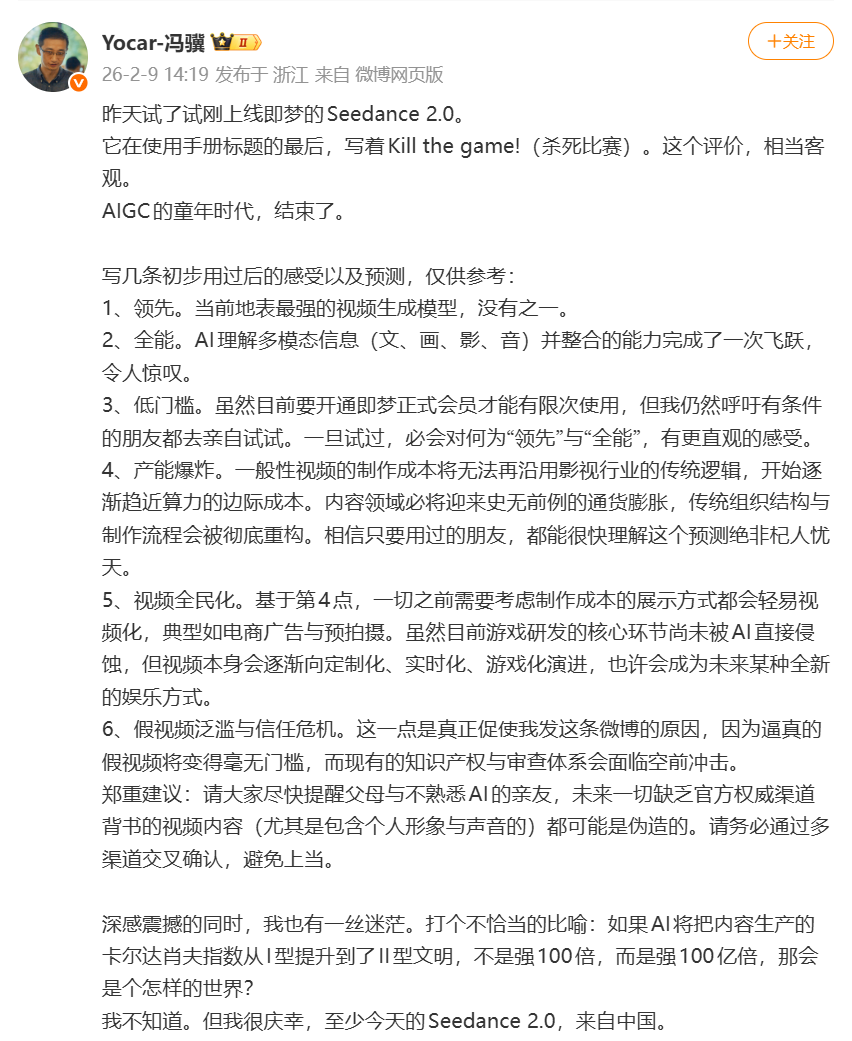 产业端反馈同样迅速。游戏科学创始人兼CEO、《黑神话·悟空》制作人冯骥在体验后评价称,Seedance 2.0是"当前地表最强的视频生成模型",并表示"很庆幸今天的Seedance 2.0来自中国"。