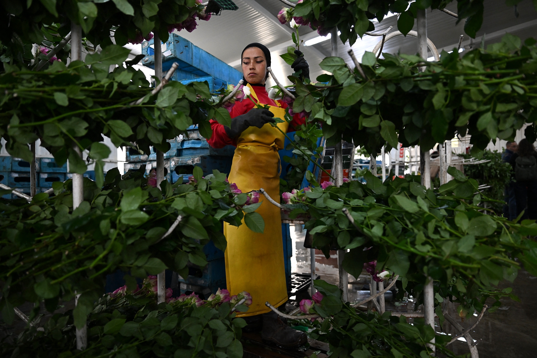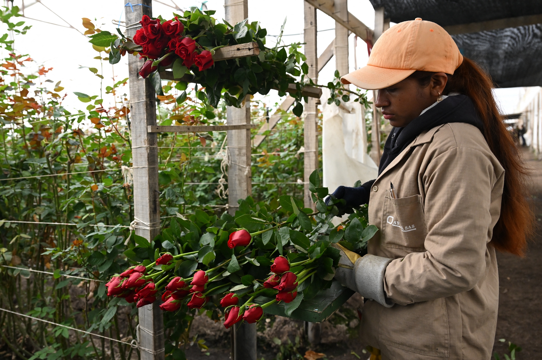 2026年2月3日,波哥大索波市(Sopo),一名工人在阿尤拉花卉农场(Ayura Flowers)采摘待出口的鲜切玫瑰。(Raul Arboleda/AFP via Getty Images)