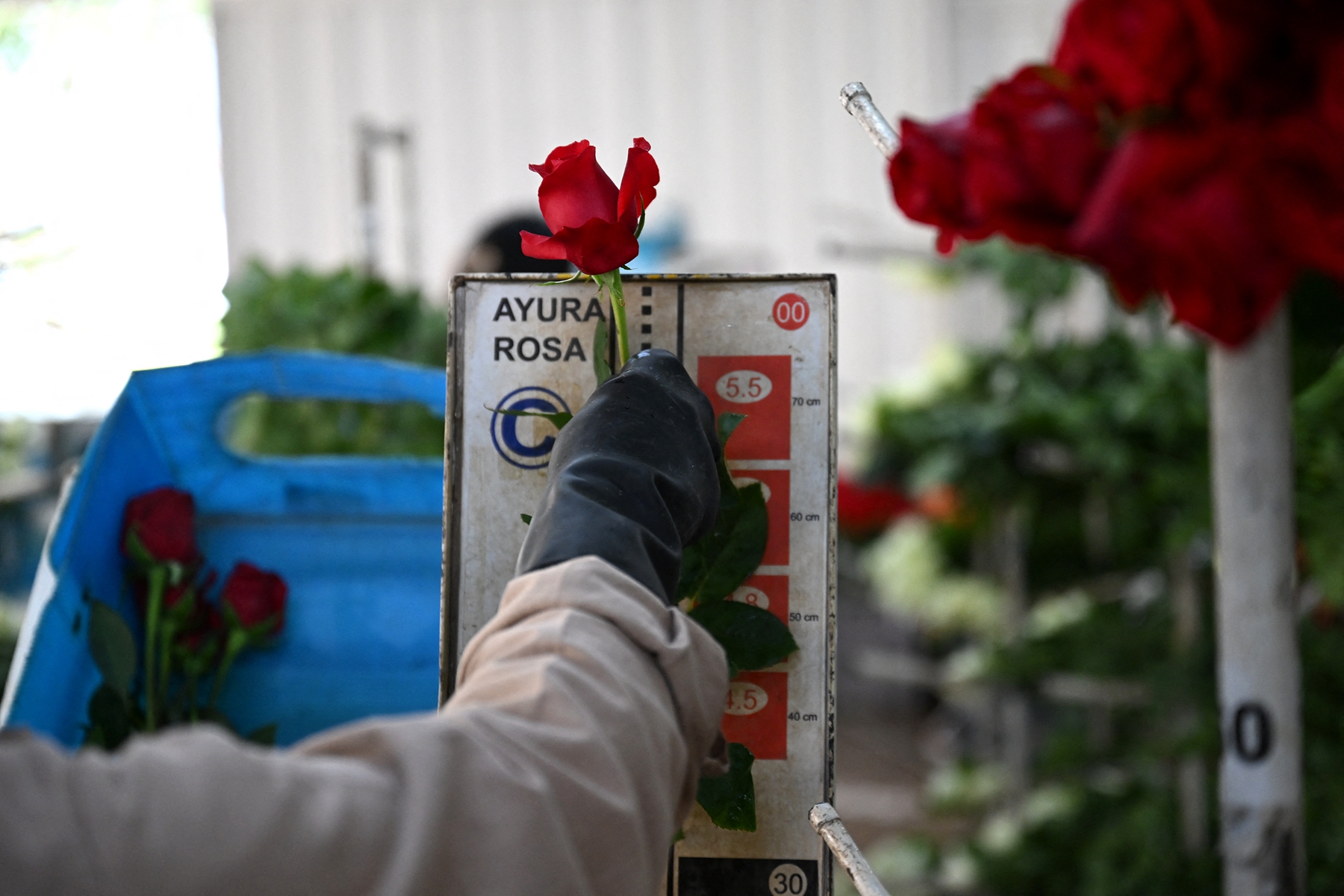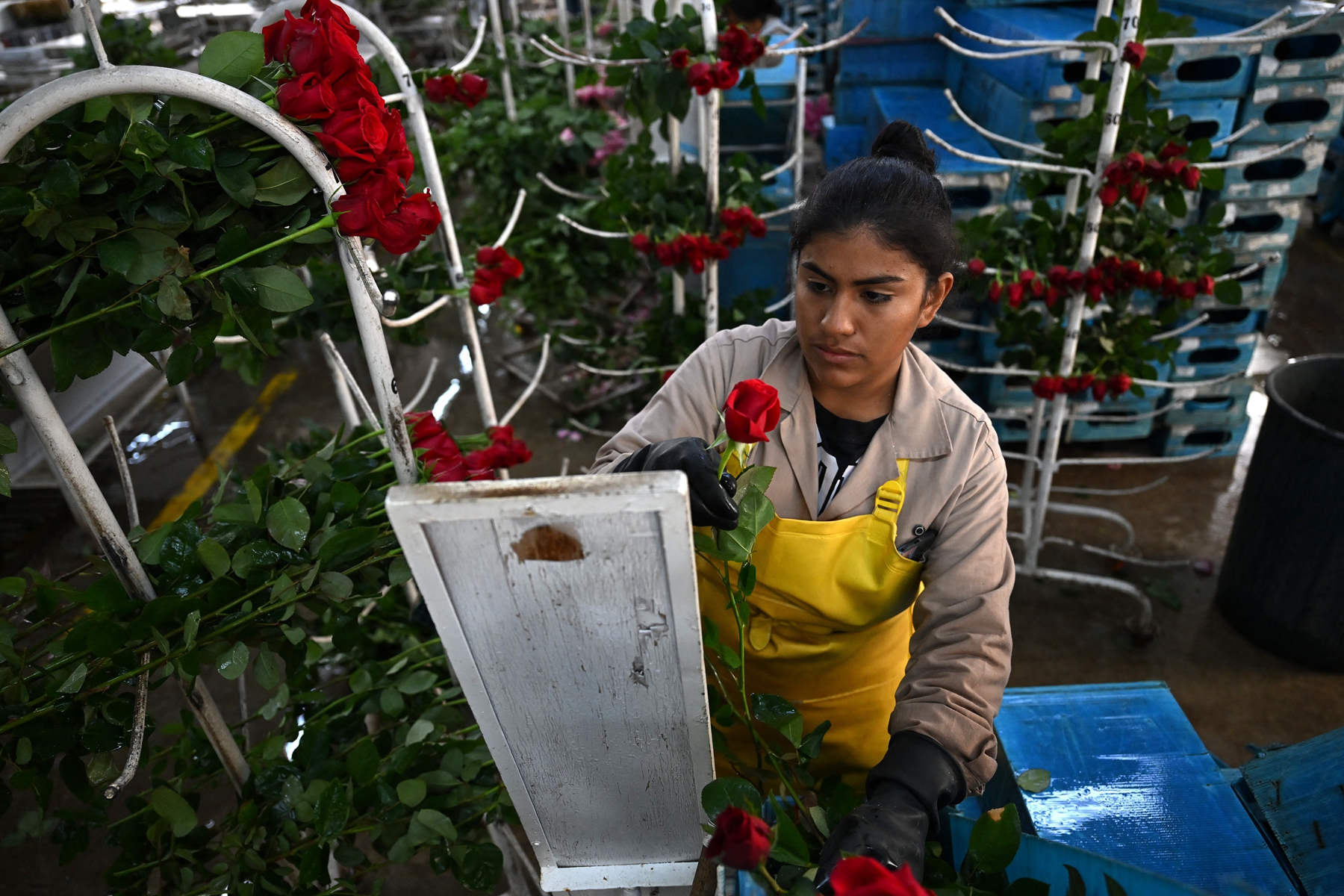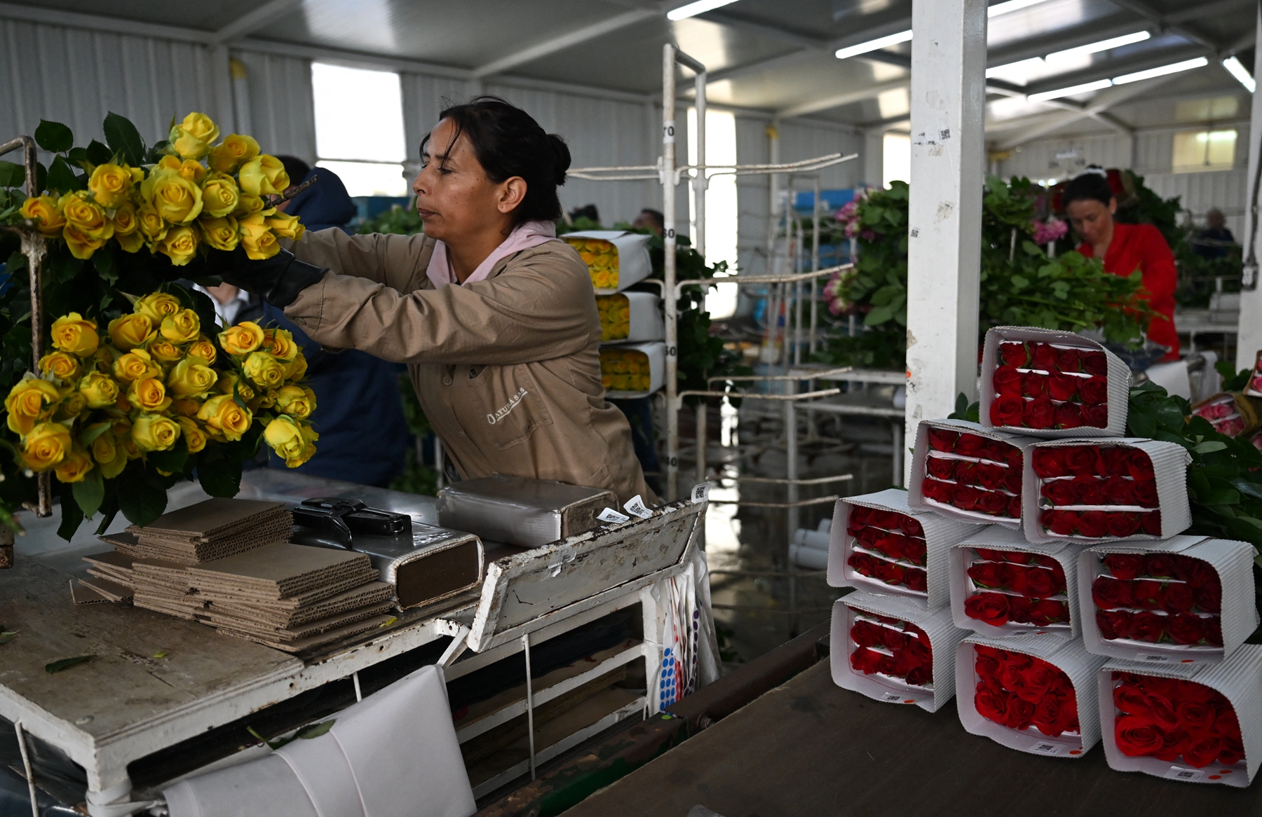 2026年2月3日,波哥大索波市(Sopo),一名工人在阿尤拉花卉农场(Ayura Flowers)整理待出口的鲜切玫瑰。(Raul Arboleda/AFP via Getty Images)