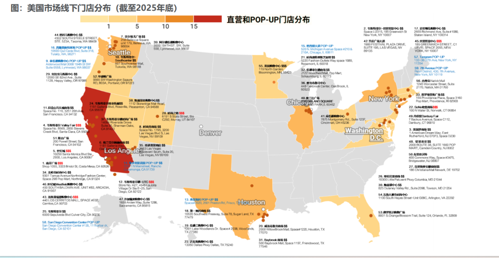 北美市场正在成为公司新的业绩增长极,其扩张策略已从初期的单点试水转向成熟的“集群化布局”。研报分析指出,泡泡玛特在北美采取了类似苹果和潘多拉的选址逻辑,预估长期开店空间在270至550家之间。目前的布局呈现出显著的战略性,例如在休斯敦、佛罗里达等地进行密集开店,形成区域渗透。