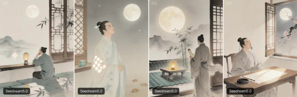 虽然Seedream 5.0有些图片生成的并不准确,但其一次性生成的图片更具多样性,从现代风、古风到卡通都有。