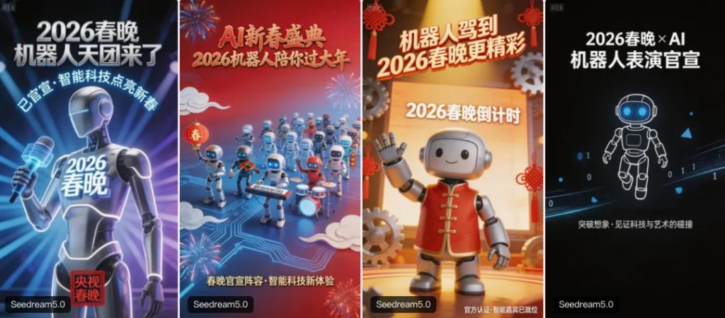 为了考验Seedream 5.0的联网搜索能力,智东西输入了提示词“最近有很多家机器人都要参加2026春晚,生成一张已官宣参加春晚的机器人海报”。