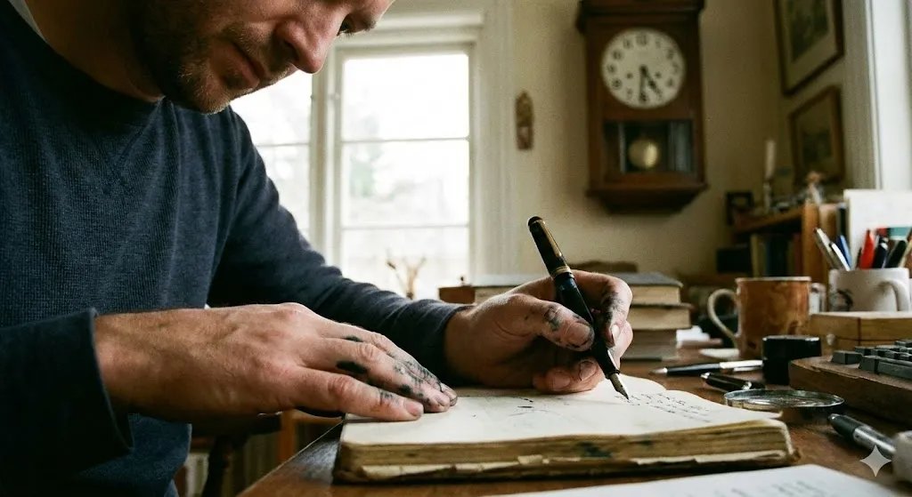 Nano Banana Pro生成的图片中,人物握笔的手为左手,可以从模糊的时钟看出其时间为5:30左右。