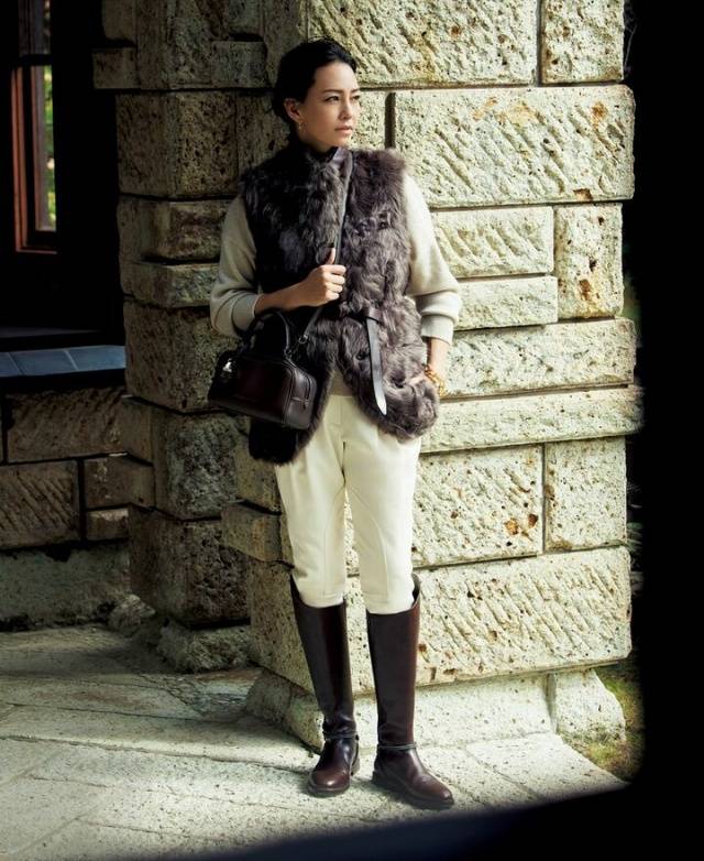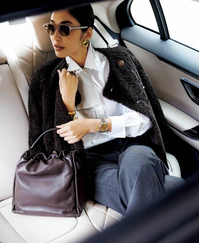 搭配塞进靴子里的裤装造型,既能营造轻快感,也非常适合驾车出行。将迷你包斜挎在肩上,与衬衫颜色完美呼应,打造出充满奢华感的优雅休闲风。