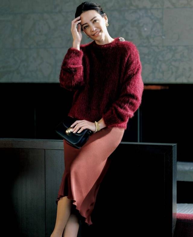 以优雅的酒红色为基调,将真丝连衣裙与马海毛针织衫进行叠穿。通过同色系不同材质的混搭,打造出兼具层次感与随性感的精致造型。酒红色自带的华丽属性,不仅彰显品味,更能确保上身效果出众。