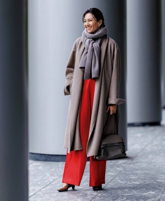 以在冬日街头格外亮眼的红色阔腿裤为主角的造型。浓郁的配色营造出温暖而温馨的氛围。如果觉得颜色过于鲜艳,只需用面积较大的长款大衣来调整全身的配色平衡即可。鲜艳的彩色裤子的冲击力得以缓和,呈现出气质优雅的端庄姿态。