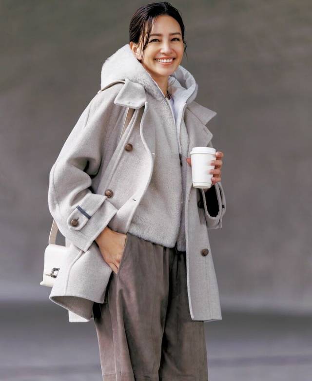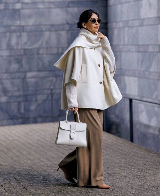 从米白色到驼色的渐变,营造出充满高级感的优雅风格。蓬松披肩垂坠感极佳,无论从哪个角度看都兼具奢华与活力。将这种充满幸福感的配色组合在一起,效果更是倍增。用同色系围巾为颈部增添节奏感,温暖又充满画面感的冬日造型俘获了众多读者的心。
