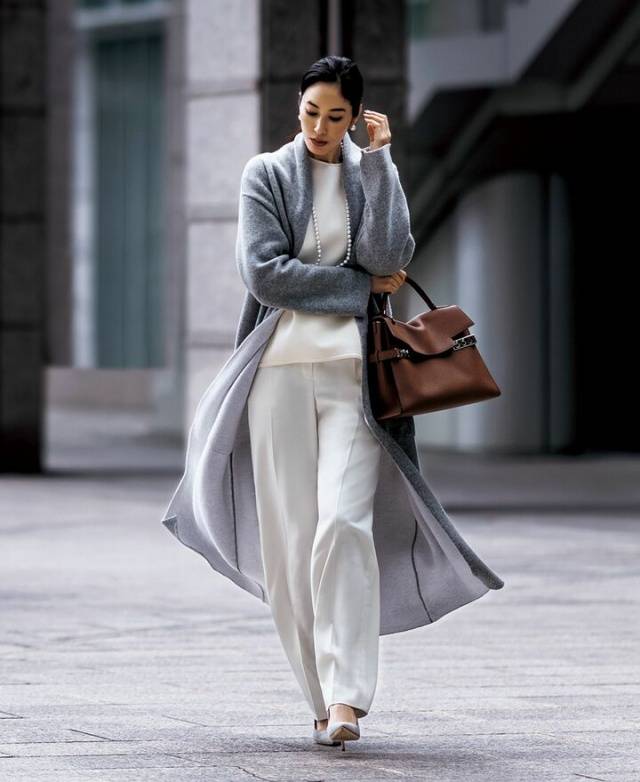 以浅灰色轻盈针织外套为主,内搭白色裤子,打造干练的穿搭风格。这款针织外套既舒适又显得正式,即使在车内也不会感到局促,是适合乘车通勤的理想选择。行走时外套随风轻摆,展现出充满活力的动感,这是其最大的魅力所在。
