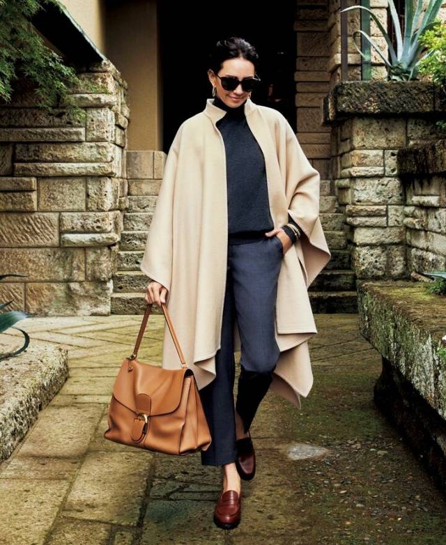 采用单层羊绒材质的长款斗篷,凭借其丰盈的量感塑造出优美的廓形,自然营造出优雅的气质。只需披在简约优质的高领针织衫与长裤的搭配之上,便能瞬间营造出极致奢华的氛围。脚踩乐福鞋增添知性气息,整体造型更显端庄得体。