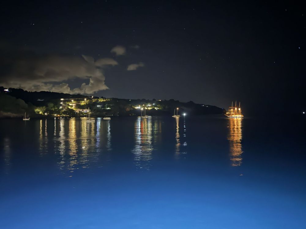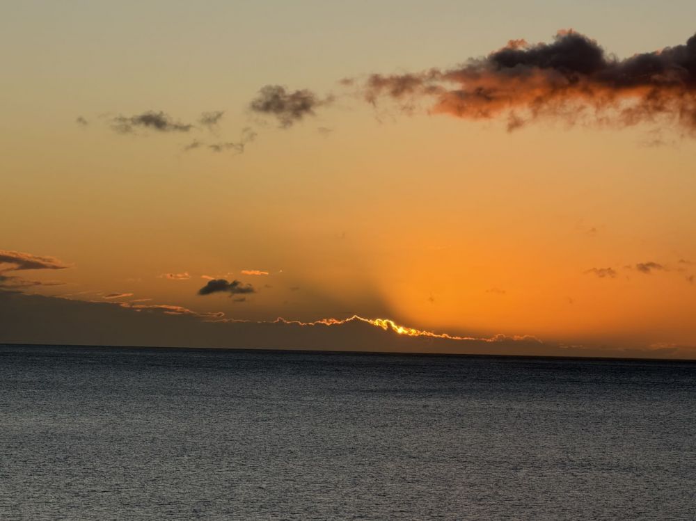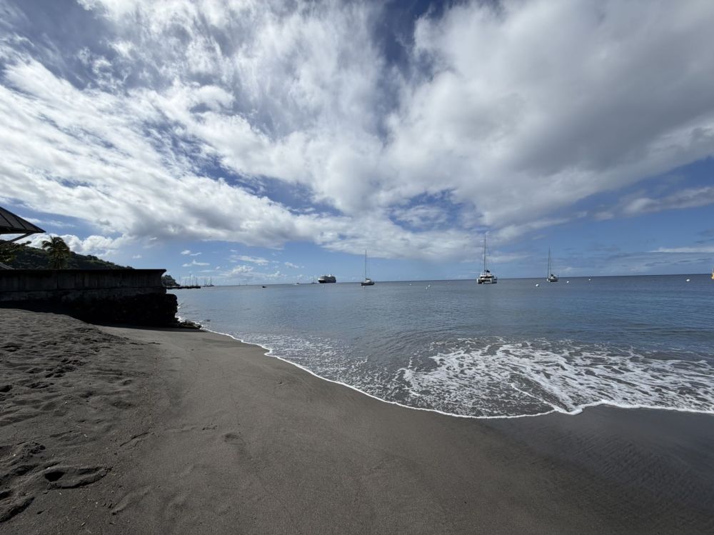 上岛之后首先映入眼帘的、也是极其引人瞩目的当然是这里大片的黑色的沙滩,完全不同于加勒比地区其他岛屿的浅淡颜色。一百多年前飘落的火山灰彻底地改变了这座小岛曾经的模样。远处的彩虹紧贴着海洋,这样的景象也是头一次看到。