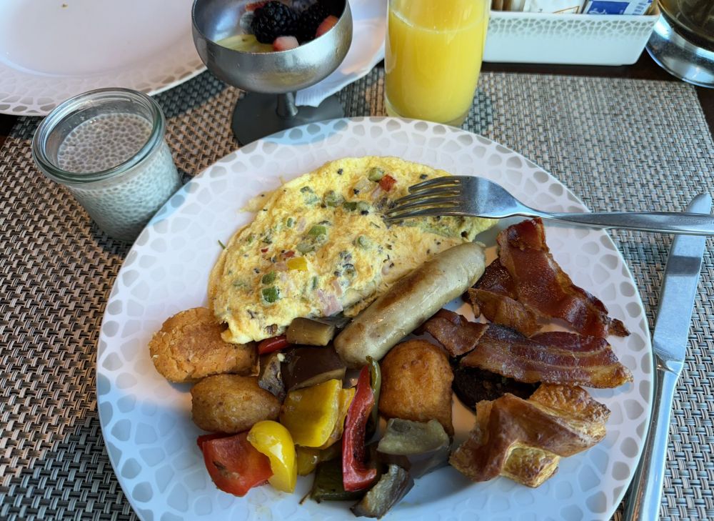 清晨,这边我们享用着有人侍应的美食,另一边天际上出现了完整的双彩虹,不远处海鸟在欢乐地飞翔鸣叫,背景是海岸边法国教堂高高的尖顶双塔,就这样开启了美好的又一天,哇!