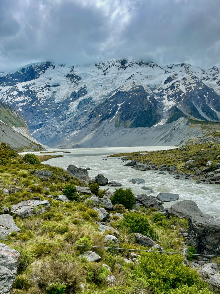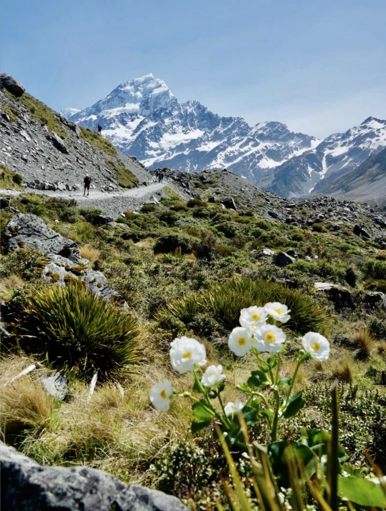 库克山国家公园Aoraki Mount Cook National Park。右图险峻雪山是南岛上的南阿尔皮斯山脉最高峰,3724米高。