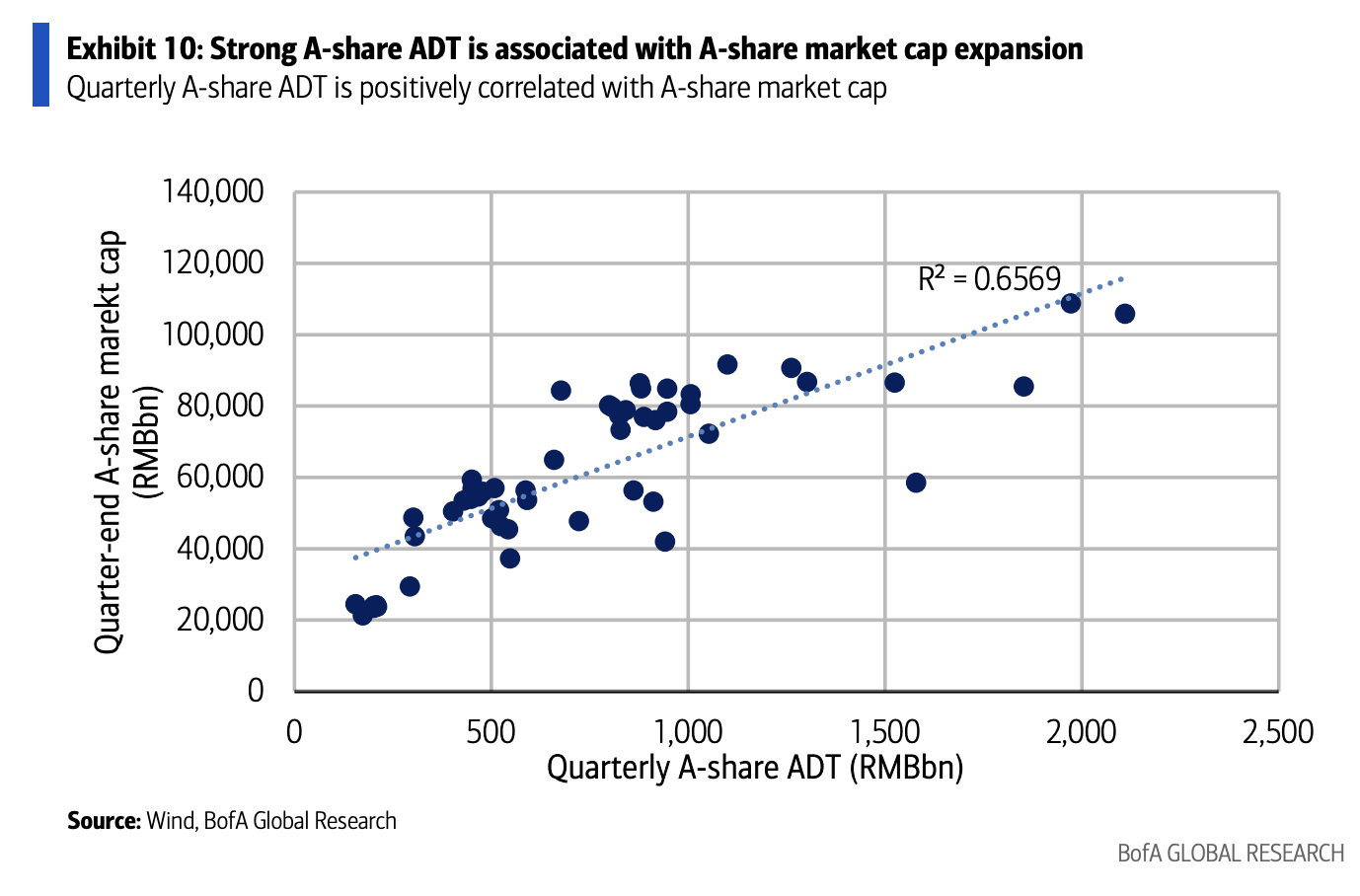 A股更依赖“成交—杠杆—市值”的链条。*报告承认5000亿或1万亿相对A股日均成交(1月一度到3.0万亿元)并不显眼,但强调它是正常资金增长之外的额外增量;同时A股市值与季度日均成交额存在正相关(报告给出的相关性R?为0.6569),成交抬升若能维持一个季度或更久,可能更容易带来市值扩张,两融也可能成为放大器。