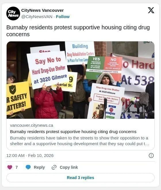 然而,社区抗议组织者 Jolie Trost 在接受 1130 NewsRadio 采访时表示,这些项目对本拿比来说“不是好主意”,因为它们可能将更多毒品带入社区。