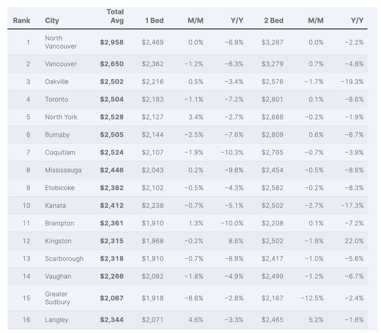 相比之下,本拿比(Burnaby)租金下降幅度更为明显,无论是环比还是同比都在下跌。