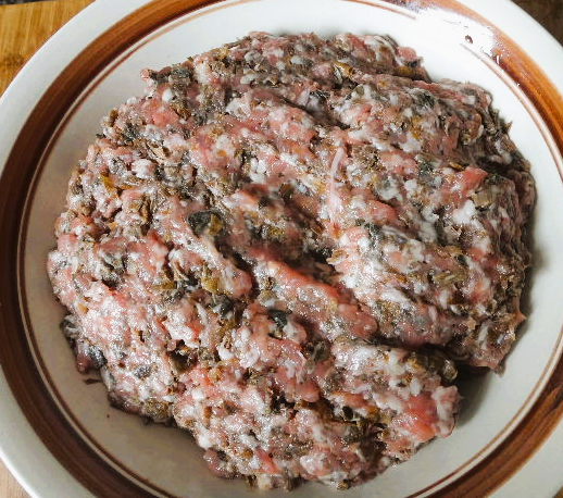 1、先把梅干菜洗干净(有泥沙沉淀下来,我洗了3次),挤干水,切细末;大蒜切细末;把梅干菜和肉馅混合,加入盐、黄酒和大蒜末,搅拌均匀。