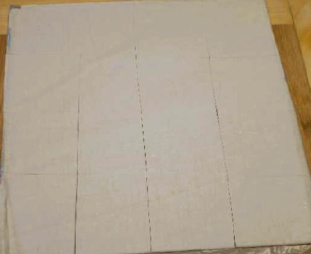2、每片酥皮用刀横竖各划3刀,变成大小均匀的16个小方块。