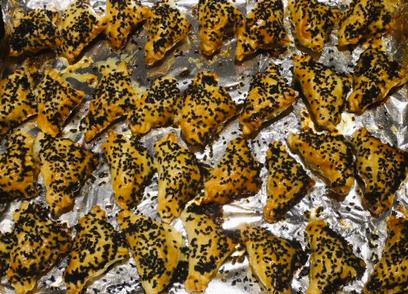 4、将包好的酥皮点心整整齐齐放入铺有锡纸的烤盘,表面刷上蛋液,然后撒上黑芝麻。