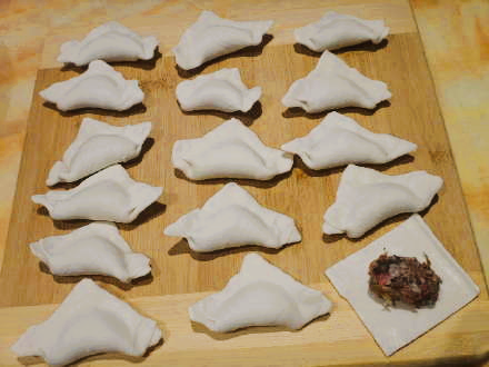 梅干菜肉酥皮点心也可以对折成长方形的“小枕头”,封口的边随意捏一些花边。