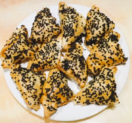 5、烤箱预热180°,放入烤盘,烤至酥皮深黄色出炉,大约20-25分钟。趁热吃,味道好极了。