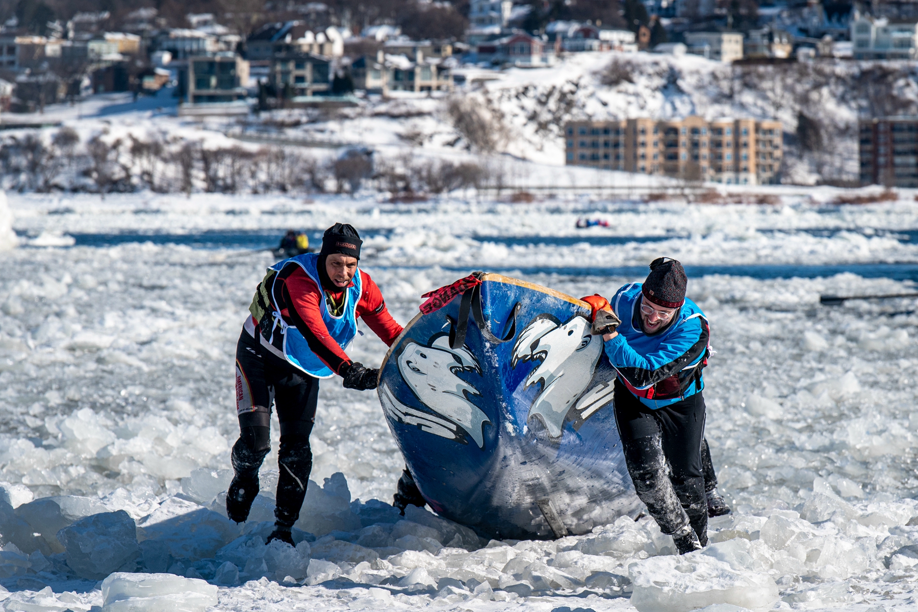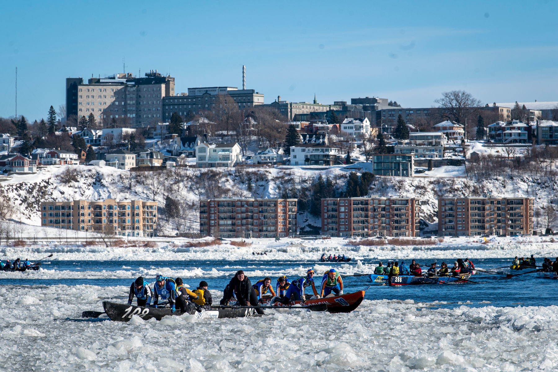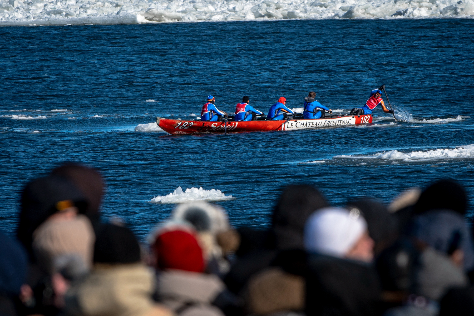 2026年2月8日,加拿大魁北克冬季嘉年华期间,赛艇运动员参加在圣劳伦斯河(Saint Lawrence River)上举行的冰上独木舟大赛。(Andrej Ivanov/Getty Images)