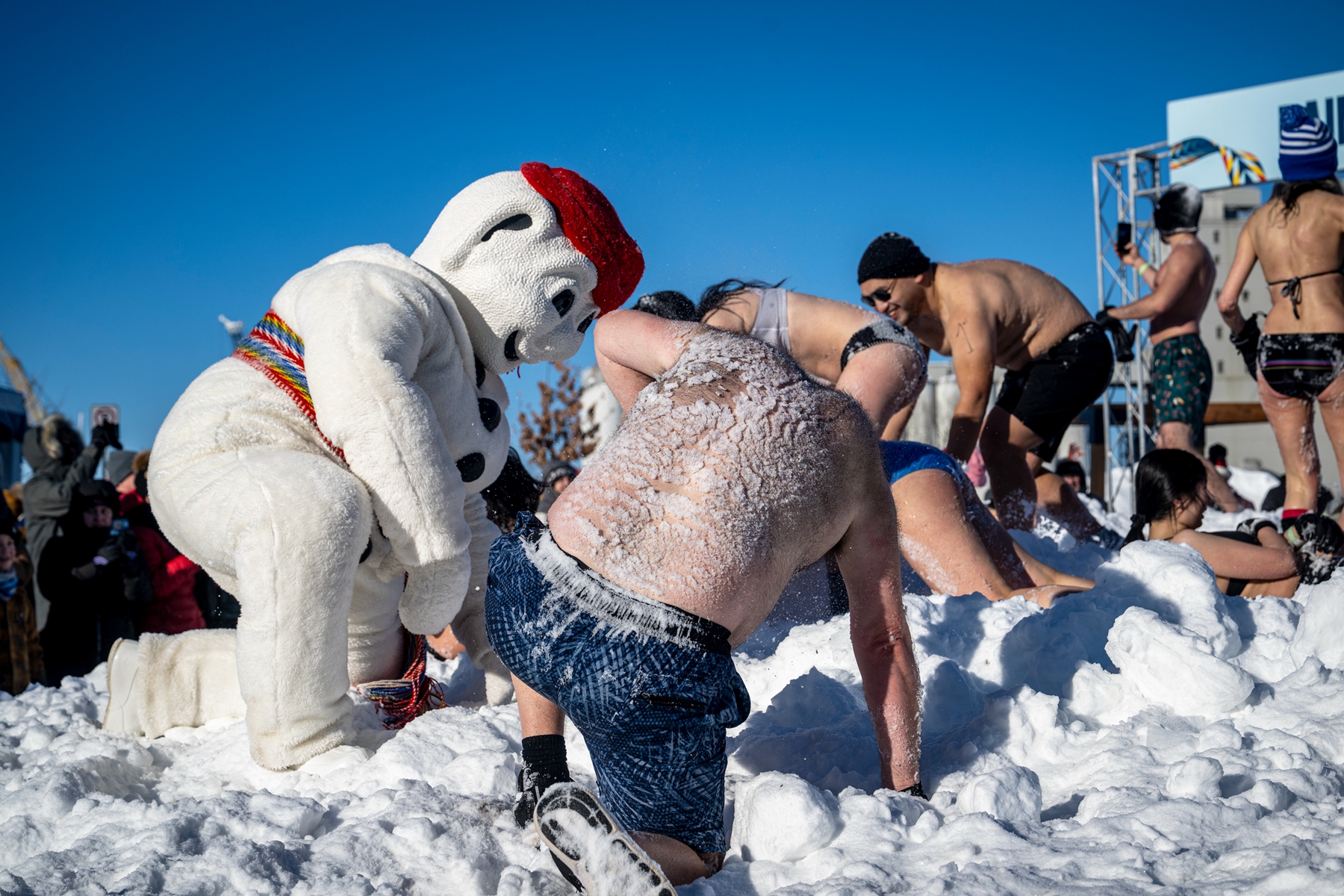 2026年2月8日,加拿大魁北克冬季嘉年华期间,不惧寒冷的人们身着泳装在雪中沐浴。(Andrej Ivanov/Getty Images)