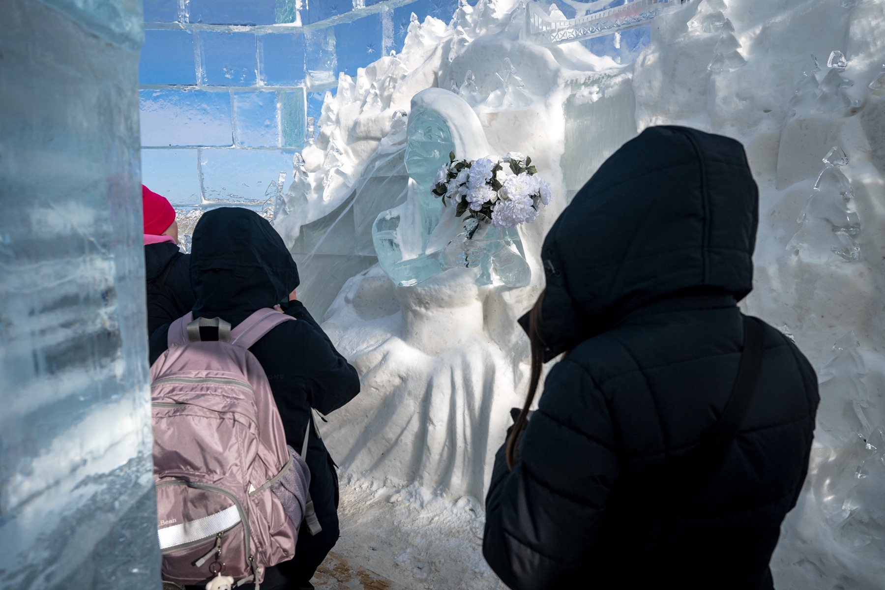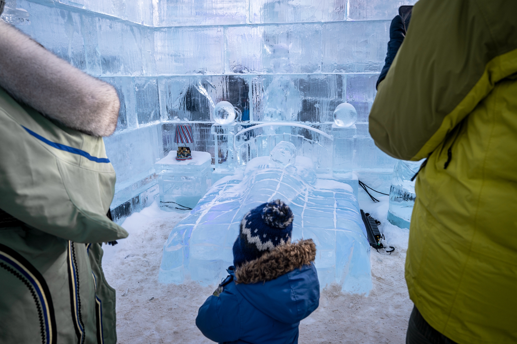 2026年2月8日,加拿大魁北克冬季嘉年华期间,人们在冰宫里观看吉祥物“博纳”(Bonhomme)的冰雕模型。(Andrej Ivanov/Getty Images)