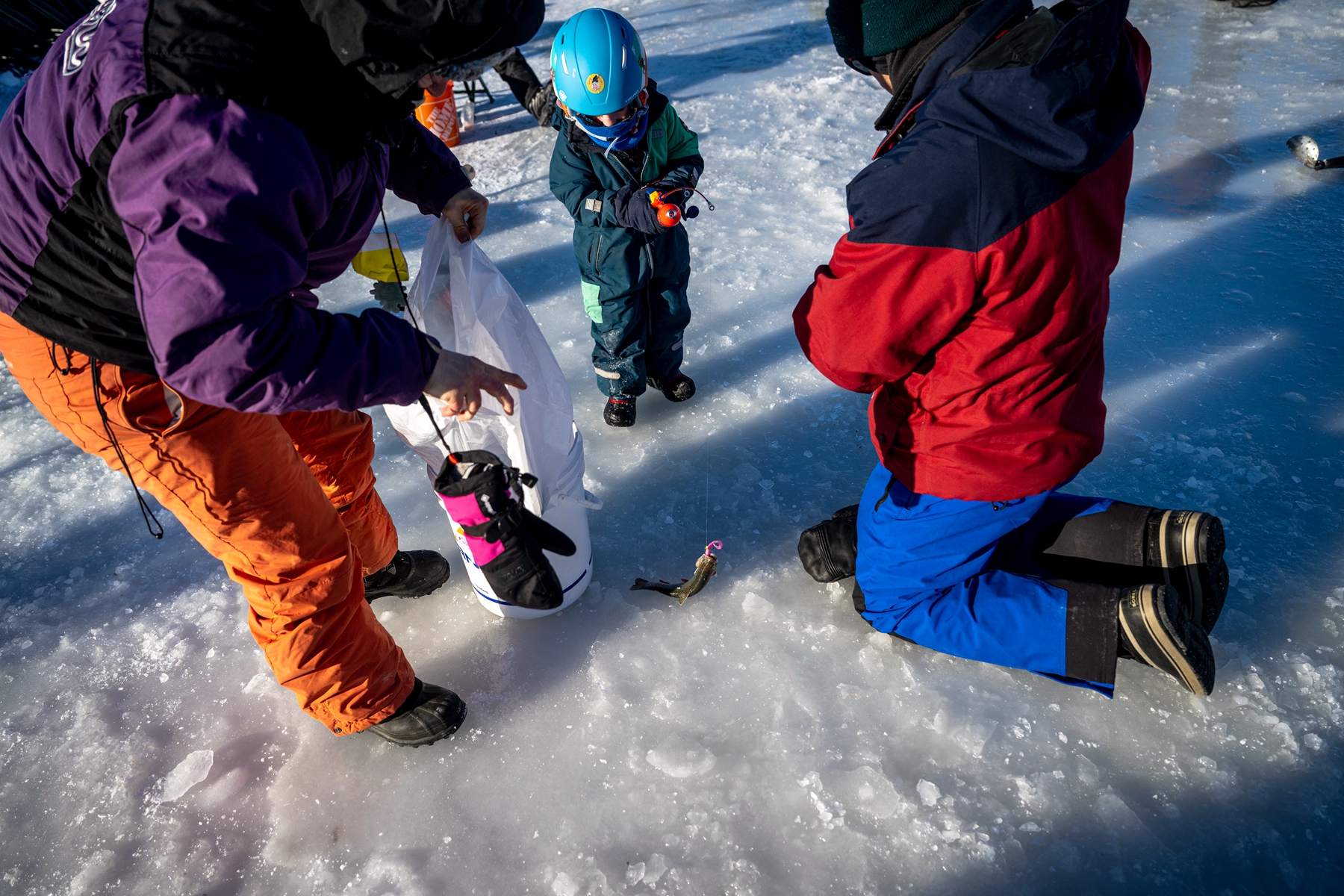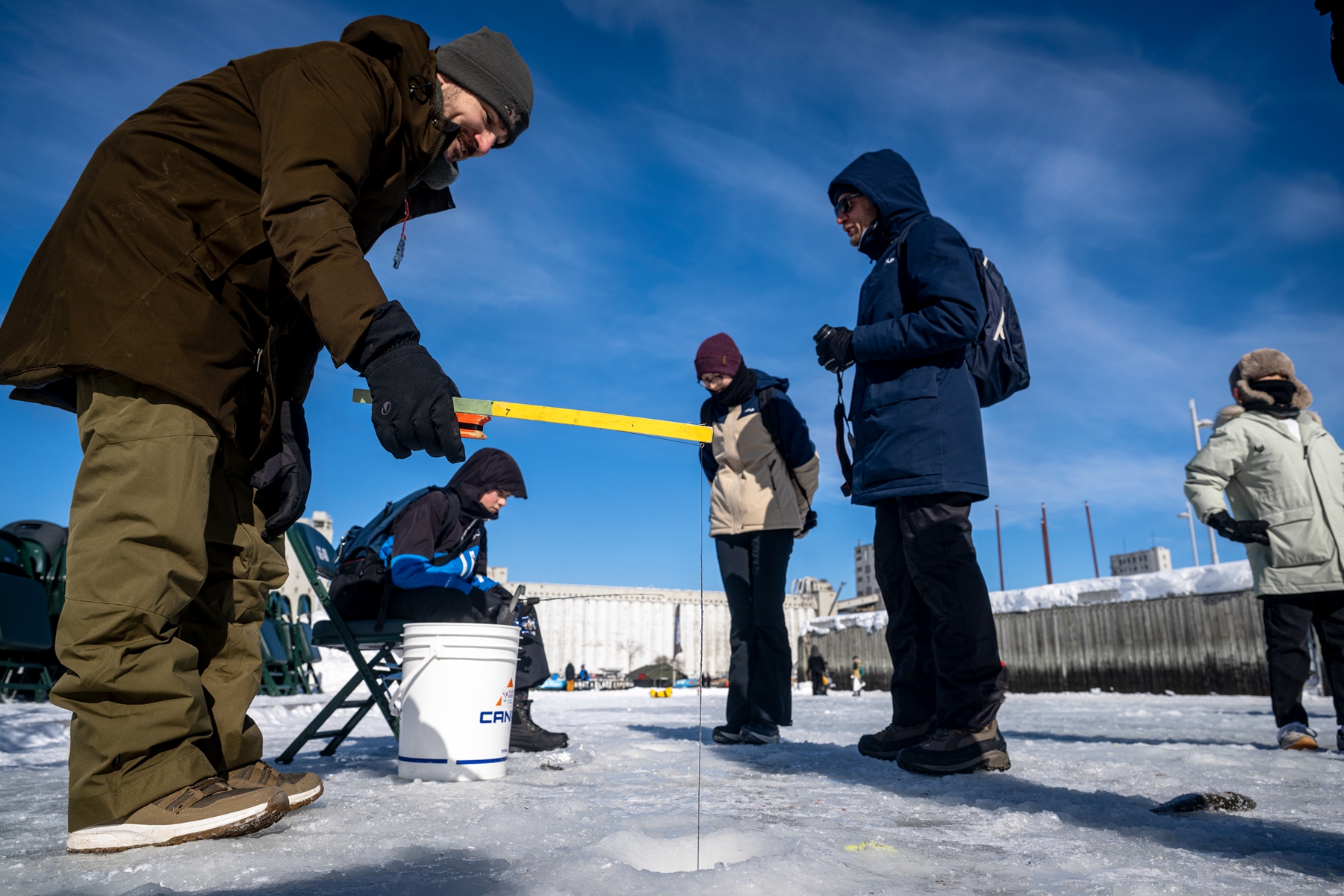 2026年2月8日,加拿大魁北克冬季嘉年华期间,人们体验冰钓乐趣。(Andrej Ivanov/Getty Images)