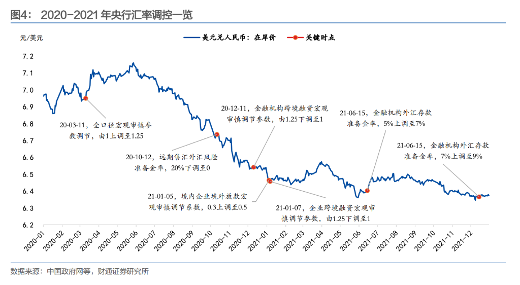 2021 年中期,面对人民币汇率的持续强势,央行启用了更为强力的数量型工具— —外汇存款准备金率。6 月 15 日,央行自 2007 年以来首次上调金融机构外汇存 款准备金率 2 个百分点(由 5%提至 7%)。此举直接锁定了银行体系内的美元流 动性,减少了市场上的外汇供给。