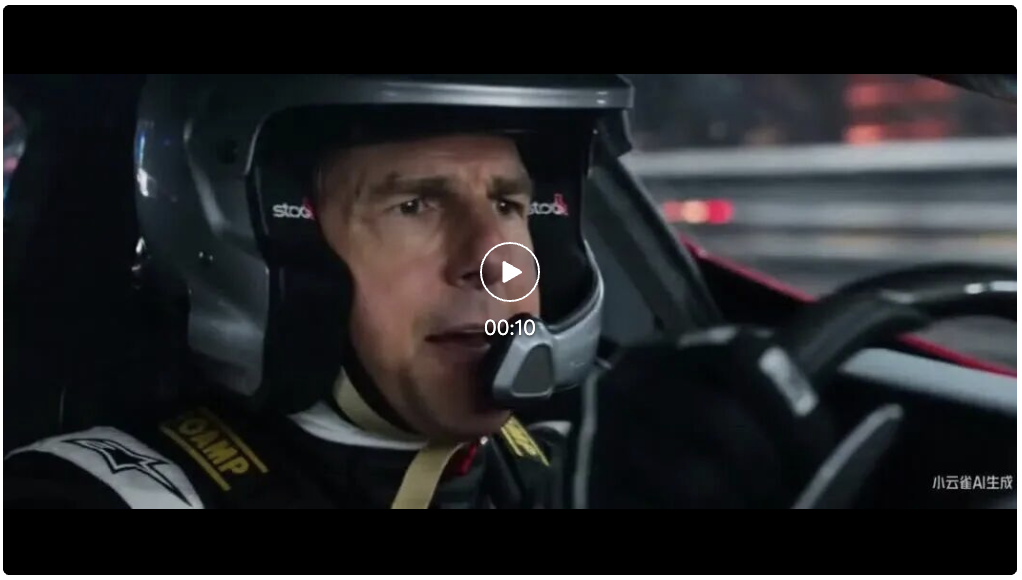 再来看这个AI版《F1狂飙飞车》,转速表飙升、刹车尖啸,太有好莱坞内味儿了嗷: